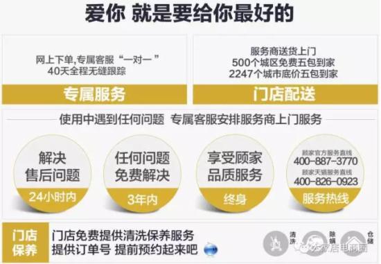 自2015年起,以顾江生董事长为代表的领导团队就曾携手3000名店长共同上门为客户清洗沙发,并提出自家产品“5年修养”的承诺,顾家家居的服务在延续与不断升级中开创了一个又一个新里程。截至2017年年底,顾家家居累计为超过35万个家庭提供了沙发修养服务。2018年3月,顾家家居基于新时期的诉求,开行业先河,推出“1键服务”,以高标准的承诺,解决了广大消费者从产品选购到使用中的后顾之忧;5月再次携手居然之家,突破品牌的界限,面向全行业全品牌,打造服务新升级!发布会现场,顾家家居和居然之家共同启动了“顾家家居服务新升级”,在场的消费者朋友都对顾家的服务理念十分赞赏,纷纷预约。