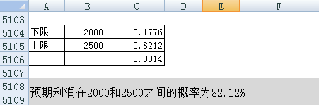 A5108:="预期利润在"&(ROUND(B5104,2))&"和"&(ROUND(B5105,2))&"之间的概率为"&(ROUND(C5105×100,2))&"%"