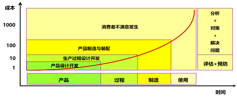 另外,从产品纠正成本角度看,当消费者应用产品后不满意时,企业需要支付数倍于设计开发的成本用于分析、对策和解决问题,而且企业也只有在产品和过程设计开发阶段进行全面评估并有效预防才能最大限度地控制产品缺陷的纠正成本。如图2.8所示。