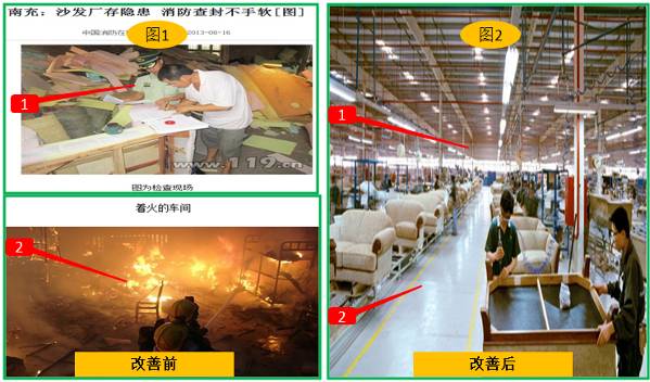 箭头2:某沙发床现场5S管理不到位引发火灾,这对企业是毁灭性的打击。