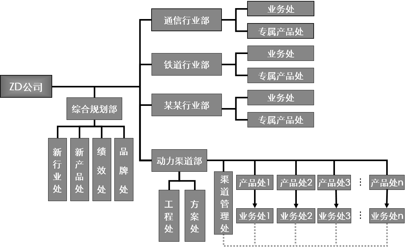 ZD公司的营销组织优化必须以公司的营销战略及策略为基础,为营销战略的落地提供组织保障,同时服务于营销策略的实施。因此,企业的营销组织需要以行业(用户)来划分,企业要筛选出优势行业或者欲开发的潜力行业,以行业为主线,设计营销组织,整合营销资源。从营销管理上,ZD公司营销组织优化必须有利于组织职能的完善和责任明确,有利于提高营销系统业务流程的效率和市场反应速度,有利于突出营销管理系统的市场功能,也有利于新行业、新产品的孵化。