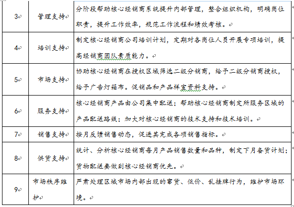 第五步:开展对核心经销商的管理支持导入。具体支持内容及措施见表1-9所示。