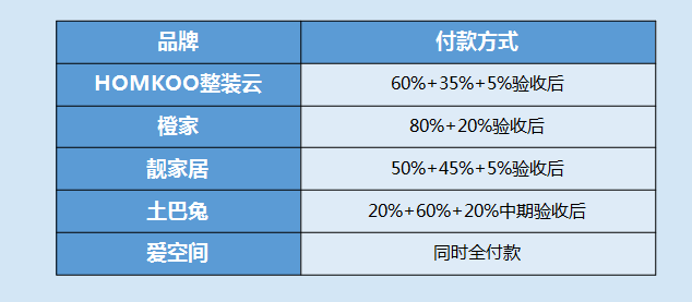 整装主流付款方式,按照施工节点收费,主要费用在施工前收取。