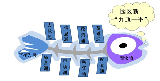 产业园区一手牵着入园企业,一手牵着区域政府,营造的是生态型的产业社区,通过合理叠加与有机整合,实现入驻企业、政府机关及公共关系的共融共生。在操盘建设中,运用“新九通一平”( 即理念通、基础通、政策通、信息通、配套通、市场通、人脉通、融资通、运营通和园区平衡发展)的理念与操作体系,推进园区的建设与运营,实现各方的互利共赢。