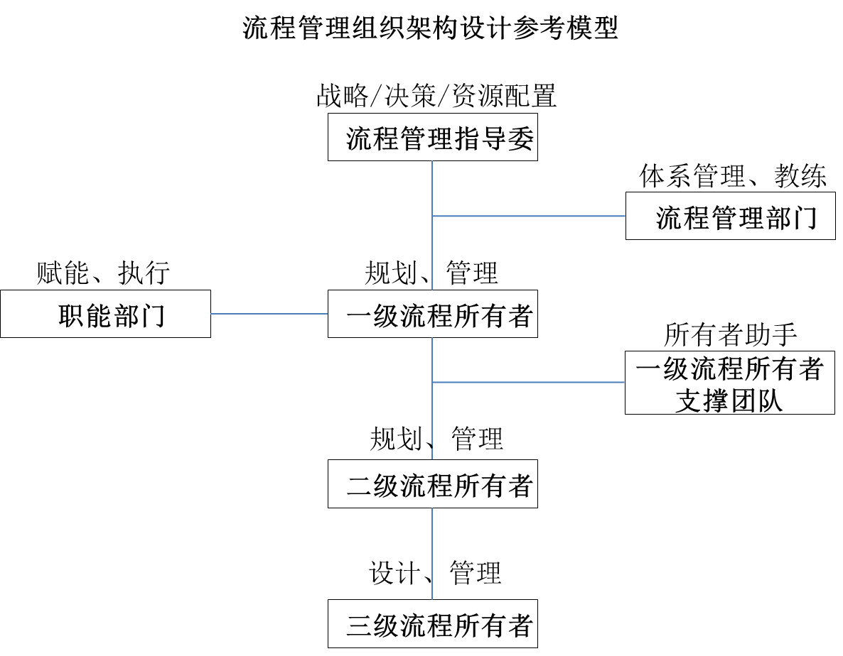 首先要考虑组织规模,对于小型组织,这个角色可以由总经理兼任,无须设置一个专门的委员会。对于大中型组织,可以考虑公司总体设置一个由公司分管副总组成的流程管理指导委员会。对于超大型组织,可以考虑在公司流程管理指导委员会的基础上,按端到端流程一级流程分级再设置相应的流程管理决策委员会,如LTC流程管理决策委员会、供应链流程管理决策委员会等。