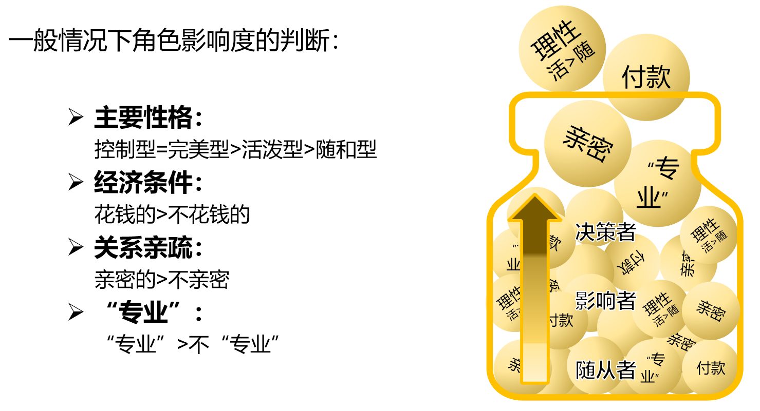 除了关系,影响比较大的是性格。以夫妻为例,女士可能成为决策者,但如果男士是强控制或强完美的性格,而女士是随和型性格,这时就会出现变数,男士就会成为决策者。