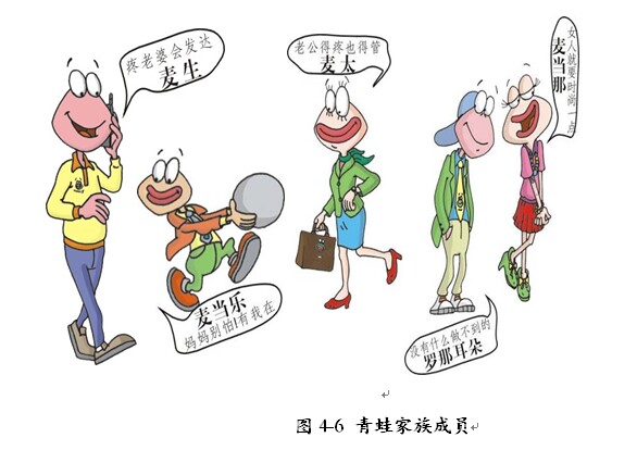 于是,青蛙家族又新添了一位成员:青蛙女儿。同时结合需要,给青蛙女儿找了一个男朋友,即整个家族之外有一个暗恋青蛙女儿的青蛙小伙,青蛙女儿代表时尚,略有小资情调;青蛙小伙代表新新人类,极具挑战性。