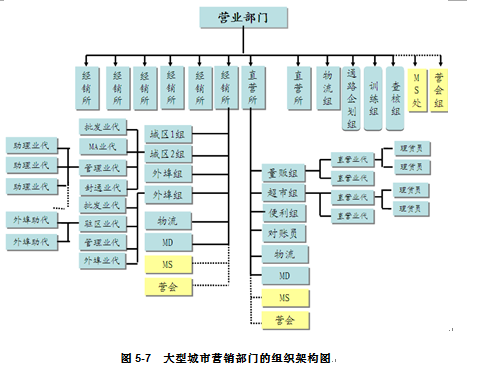 在上述组织架构中,营业所组织架构基本相同。经销所一般由城区组与外埠组组成,少数营业所还包括直营组。除营业组之外,营业所还配备所MD、所MS、物流与营会人员。城区组一般由管理业代、MA业代、批发业代、封闭通路业代与助理业代组成。外埠组除了管理业代、MA业代、批发业代、封闭通路业代与助理业代之外,还由外埠业代、驻区业代、外埠助代及车销助代负责外埠乡镇市场。经销所中的直营组一般由KA业代与封闭通路业代组成。