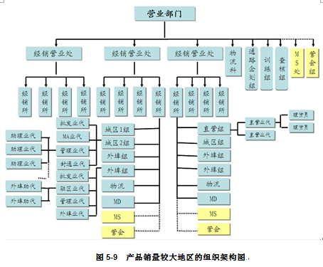 营业部门由8~12个经销营业所组成,分成3个经销营业处,并配备通路企划组、训练组、查核组及MS处、物流科、营会组等单位,具体架构如图5-9所示。