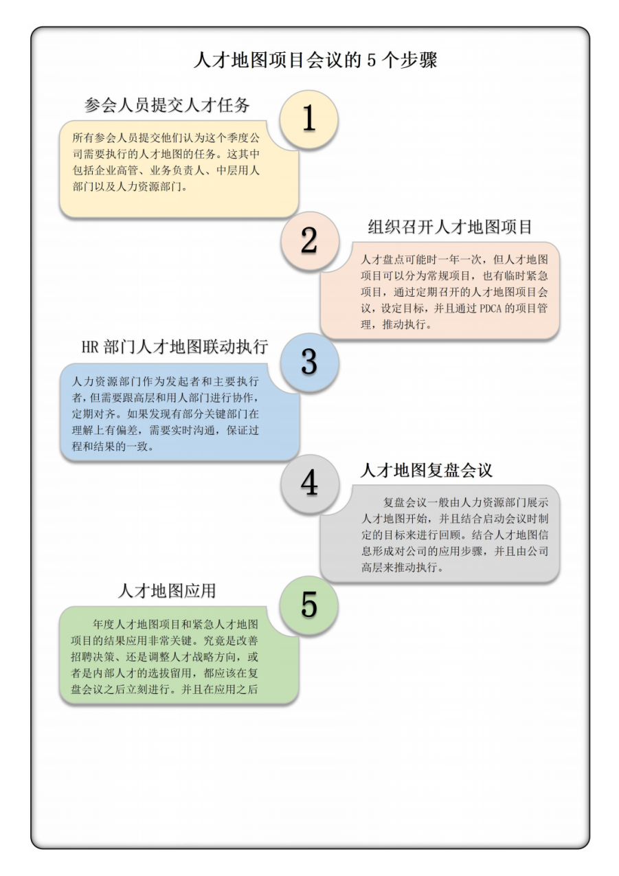 复盘会议一般由人力资源部门展示人才地图,并且结合启动会议时制定的目标来进行回顾。结合人才地图信息形成对公司的应用步骤,并且由公司高层推动执行。