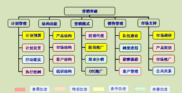 可以对照一下,销售系统到底存在什么问题?计划薄弱就解决计划,人员缺乏就招聘人才,缺乏策划就自己策划或者请专业机构策划。总而言之,所谓营销系统的再造,是需要通过重点问题的解决来逐步实现的。