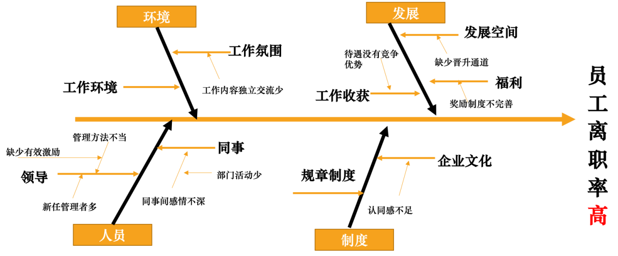其次,公司流失率高,要综合分析,一般不是老板的原因,老板都是惜才的,只是如何有效找到匹配的人,要综合分析很多因素,这样刚好用到“鱼骨头分析法”, 鱼骨图(又名因果图、石川图),指的是一种发现问题“根本原因”的分析方法,现代工商管理教育将其划分为问题型、原因型及对策型鱼骨图等几类。