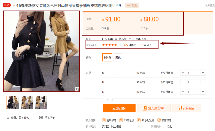 图1-14的价格是在许多人接受范围以外的,图1-15的价格在许多人接受范围以内。(请注意:这款宝贝的两张图是一样的,可能面料也是一样的)。从两张图中,我们看到第二张的销量明显多于第一张的销量,并且我们可以看出为什么他的销量会比第一张好,因为价格定位占了很大的主导地位!另外这也告诉我们一个真理:符合价格定位区间、属于绝大部分客户接受范围内的价位一定能有个好的销售量。