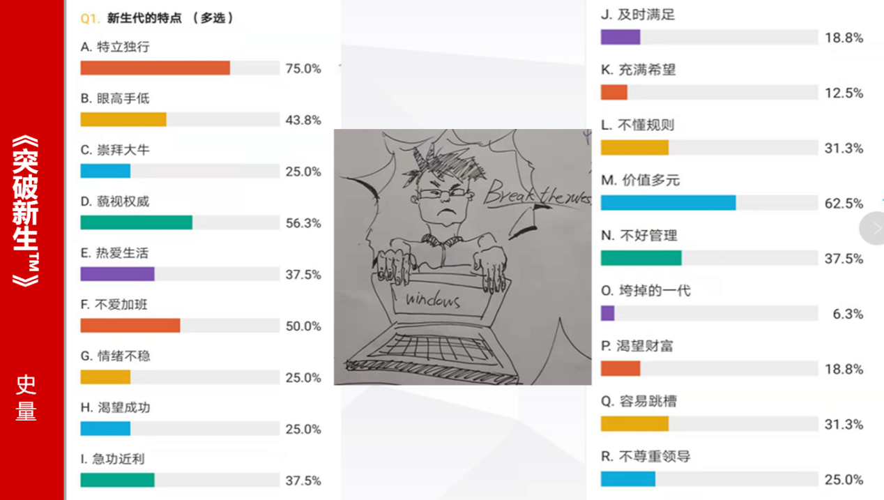 (1)随着新生代(“90后”“95后”“00后”)进入职场,代际的特征越来越明显,他们和“70后”“80后”不一样,缺乏对管理权威的尊重,会让你管理的职位影响力瞬间消失;
