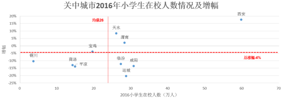 从小学生2016年在校生人数看,关中城市群2016年小学生在校人数为253万人,占全国小学生在校人数9913万人的2.6%,远低于城市群占全国总人口比重11%的水平;关中城市群10个城市小学生在校生人数总涨幅为-4%;重点关注城市西安、天水、渭南。