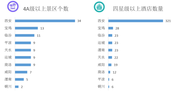 关中城市群共有4A级以上景区108个,占全国4A级以上景区1335个的8%。四星级以上酒店483个,其中四星级以上酒店达到200家以上的城市有1个,为西安,其余均在100以下。