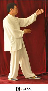 接上式,腰微拱成后坐式,重心落右腿上,右手臂随腰后拱向外旋转,回收至腹前,掌心斜朝上,随即含胸往上提腰,右臂往里旋转向前向上推出,重心渐渐移于左腿右脚跟提起,右腰往右外上提,左腰向左后下沉,同时右腰向右外旋转。两臂同时右臂向外旋转,左臂向里大旋转划圆,腰微拱,右脚跟随即向前向里移动少许落下;腰微微下沉,重心渐渐全部移落右腿,左腿成虚步。左臂外旋使掌心朝左,左掌随重心前移向前划伸至胸前正前方,左指上指, 掌心向右微屈,屈右肘,腰微含上提,右腕随腰向里提回,左掌翻掌下按,左脚略里收,前脚掌点地,成左虚步;腰向下沉,坐实右腿,右掌随沉腰向前下插掌,掌心向左。左掌弧形下落于左胯旁; 眼神前下视,观注下插的右手(见图6-154至156)。