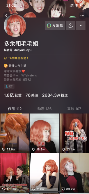 比如“多余和毛毛姐”,一个男生同时扮演男女两个不同的角色,自己与自己进行对话和沟通,没想到女版人物比男版人物更受粉丝欢迎。抖音账号“乔万旭”,主播也是一个人扮演多个角色,很受欢迎。抖音里很多男生化妆变美女的视频,都很受欢迎,比如“阿纯”。动物与人的角色互换,代表账号是“会说话的刘二豆”“金毛蛋黄”等。语言模仿,参考“张大仙”。角色扮演的账号如图5-18所示。
