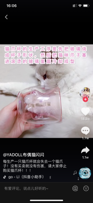 关联创意,俗称“蹭热点”。星巴克猫爪杯突然在网络走红,有客户为了购买限量供应的猫爪杯大打出手,全网轰动。很多抖音账号于是借助猫爪杯的热点,进行关联创意,视频火爆,如图5-19所示。