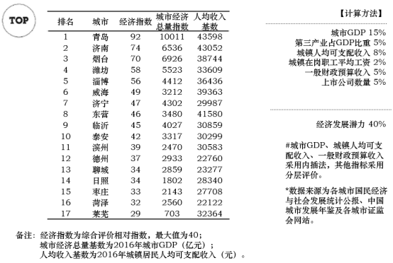 山东半岛城市群城市经济总量基数均值为3635亿元,人均收入基数均值为31744元。经济指数TOP3的城市为青岛、济南、烟台。