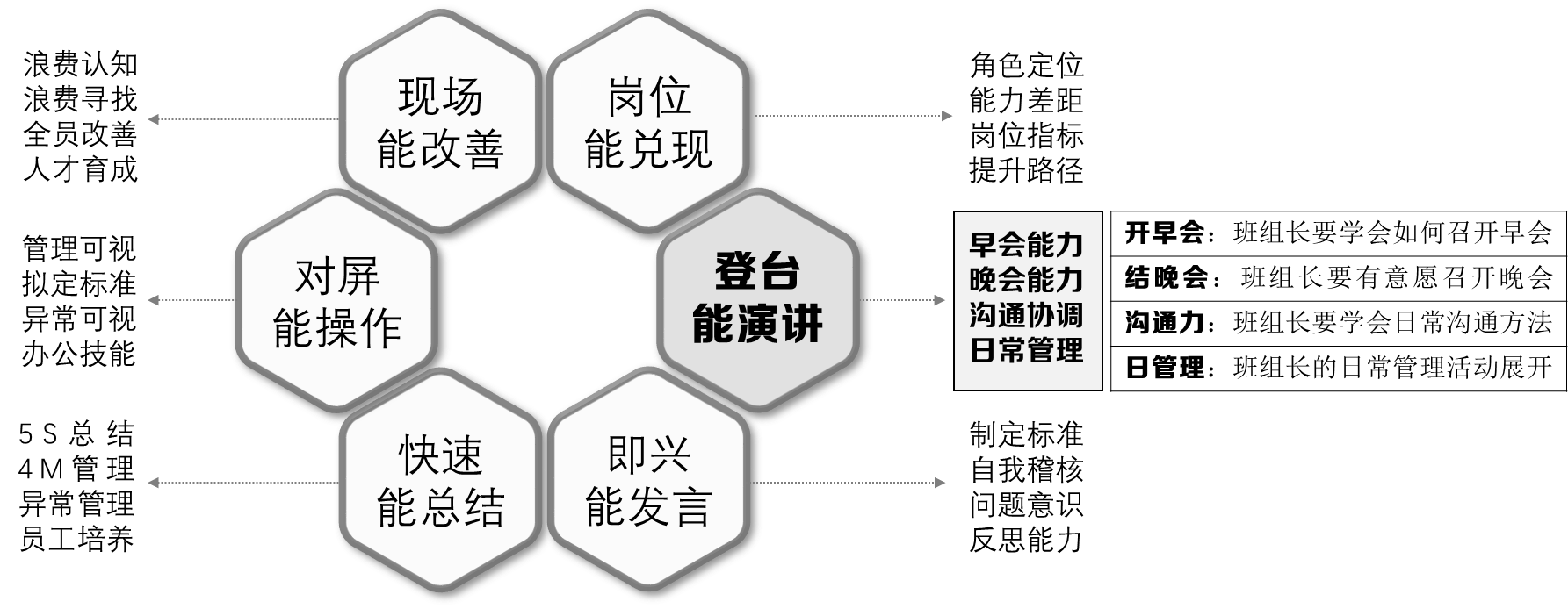 登台能演讲:基层班组长在班组长这个岗位上,必须要具备登台讲话的能力,这个“台”指的不是大会场,指的是班组这个小舞台,这个“演讲”指的也不是演讲比赛,而是班组长的日常沟通能力,站着这个小舞台上,班组长必须具备开早会晚会的能力、白夜班交接的能力、上级/横向/下级沟通的能力、日常管理的能力。能够充分的进行表达出来,才能说明班组长具备这个管理实践能力。