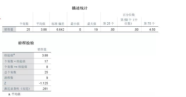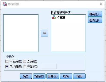 并在菜单栏选择选择分析-非参数检验-旧对话框-游程,然后把销售量作为检验变量列表,平均值为分割点。