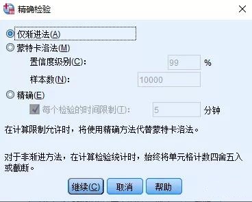 精确:指精确计算显著性水平的方法。该方法得到精确的显著性水平,不需要渐进方法的假设,不足之处是计算量和所需内存太大。选择该选项后,可以选择每个检验的时间限制来设置计算时间限制。默认时间限制为5分钟,超过该时间系统会自动停止运算并给出计算结果。