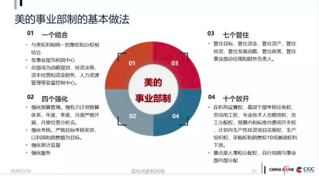 四个强化:将权力分配给各个部门,总部的角色是做投资规划、资本运营、人力资源管理等,事业部是利润中心,全责承担产品的经营。