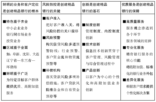我国金融业逐步融入金融全球化时代,银行同业竞争日趋激烈,客户需求层次不断提高,如何在激烈的竞争中求生存、谋发展,已成为各个商业银行面临的重要课题。中小银行面对严酷的金融环境和强劲的竞争对手,想在高手云集的情况下脱颖而出,就必须发挥特长,打造出具有自身业务特色、流程特色、人才特色、品牌特色的精品银行。精品银行的核心指标如表1-7所示,精品银行的核心内涵如表1-8所示。