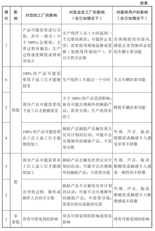 表2-6 PFMEA严重度评分标准