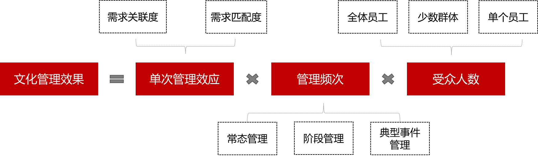 单次管理效应:是指采取一次管理动作,能够对员工的认知、信念和行为产生多大作用。文化要想对人的行为产生作用,采取的举措就必须与人的需求关联起来,而且要根据不同层次的人匹配不同的需求,对基层员工多用物质激励驱动,少谈使命和理想,对高层干部多用使命和成就感驱动,不能单纯地用物质激励。