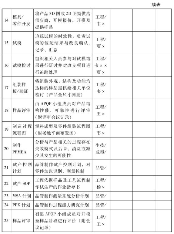 第一阶段项目总结评审前,项目经理要组建APQP多功能小组,小组成员主要由PMC、业务、品质、研发、工程、采购等部门成员组成。多功能小组要定期召开项目进度会议,就接口问题加强沟通,并签署保密协议。如表1-2-7。