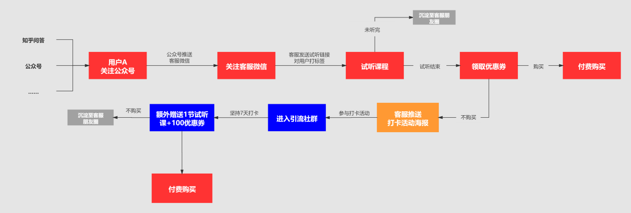 图11-1是一个知识付费类社群策划的一场活动,主要目的是推广系列课。整个活动大致流程是:首先,在知乎问答这类第三方平台上面进行活动曝光,当目标用户看到活动海报后,点进其中的链接可以关注公众号,并自动推送客服微信,只要用户添加好友后就可以免费试听一节课程的内容。因为系列课有三门,分别是用户运营、内容运营及社群运营,所以等用户添加微信之后,客服首先会简单做一个询问,主要目的就是给客户打上标签。之后把用户感兴趣的相关系列课的试听链接发给他。等用户听完后,后台系统会自动跳出一个领取优惠券的页面。