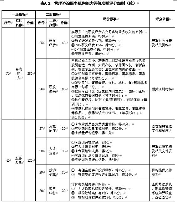为了评价管理咨询师是否达到所申请等级的咨询理论和实践水平,具备相应等级的职业咨询能力,评价机构应依本细则表A.2和表A.3所载的8项内容(涵盖了管理咨询师基本职业素养、管理咨询师通识、咨询师专业能力;学历与职称、获奖情况、咨询成果、咨询案例、咨询能力)进行评价,然后采用机考或现场答辩评审两种方式对评价对象进行能力评价。