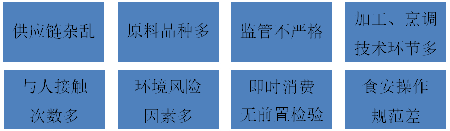 在国内,由于餐饮的供应链杂乱、原料品种多、监管不严格、加工和烹调环节多、与人接触次数多、环境风险因素多、无消费前检验时间、食安操作规范差等原因,从而使餐饮食品卫生的风险系数较高、隐患较多。