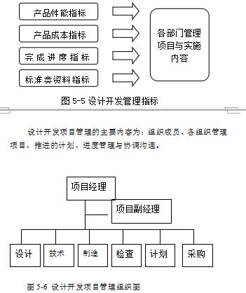 图5-6为设计开发项目管理的组织图案例,设计开发项目管理负责人一般为2人,这是比较独特的(一般项目管理只设一个负责人)。这2人的分工,一个人负责设计上的技术方面,此人技术功底较厚,技术设计经验丰富,特别是对各种技术如何接口方面有敏锐的眼光;另一人具有一定的技术背景,对企业管理流程熟知,协调能力突出,主要负责计划、进度管理与协调沟通。至于这2人谁做项目经理与副经理要视产品复杂程度与协调难度来定。一般来说,较复杂的产品其设计难度大,协调难度也大,此时,让有一定技术背景,协调能力强、管理能力强的人担任项目经理,此人一方面跟踪设计开发进度,但更重要的是跟踪所有部门的进度,协调各部门密切配合;另一个技术设计经验丰富的人做项目副经理,集中精力进行设计方案规划、设计方案评审、设计进度跟踪等。若是简单产品开发,让设计开发经验丰富的人做项目经理,让协调能力强的人做副手,这是因为简单产品开发,各部门需要准备的内容少,协调相对容易。另外,要强调一点是协调能力强的人做项目经理(或副经理),并不要求是本身在公司中具有较高职位,在设计开发项目小组中某些成员在公司的职位可能高于项目经理(或副经理)是经常存在的现象。