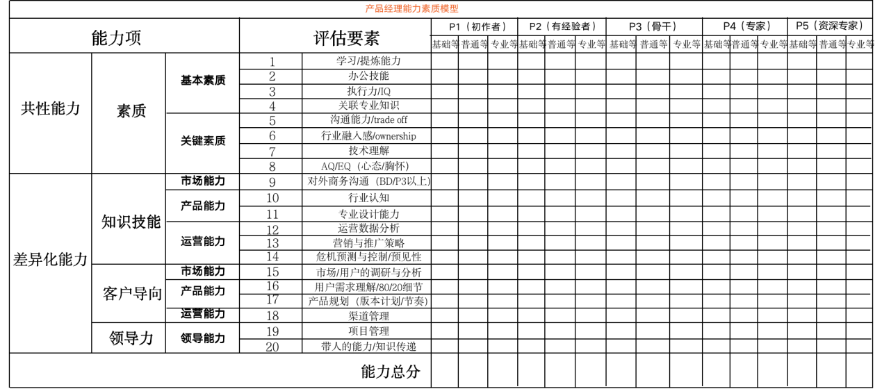 这是一个将“N+X”结合起来的专业序列素质模型,“N”是共性能力,有1类能力类别“素质”,2项能力要求,分为“基本素质”和“关键素质”;这个称为“素质”的共性能力要求被认为是多个工作性质类似的专业序列人员大家都需具备的共性能力;“X”是差异化能力,共有3类能力类别:“知识技能”“客户导向”“领导力”,7项能力要求;加起来共4类9项的能力指标要求。而对应的每项能力要求后面都有不同的评估要素,对应到P1到P5不同等级的专业人员在评估要素上的指标数量和分数的要求也是各不同的。当然,对应每一项评估要素应该有一个具体的行为解读,才能用于专业人员的能力评估。细心的读者会问,有了行为解读以后,是否还要行为分级呢?第三节已经介绍了,我的建议是要根据企业的业务特点和模型应用的目的来综合考虑是否还要做行为分级。