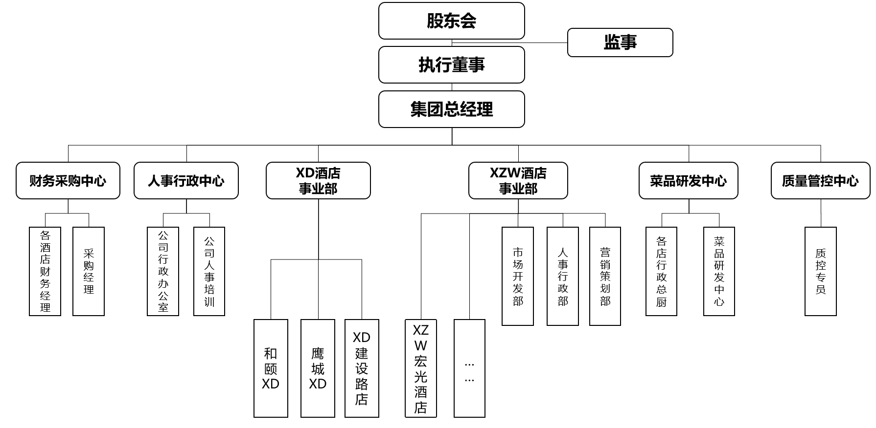 第三步、明确公司各层级布局:控股层(控股股东法人公司),传承层(创始大股东的家族传承法人公司),持股层(过往内部管理团队持股有限合伙企业、未来激励持股有限合伙企业等),主体层(郑州XD酒店集团),产业层控股子公司(XD酒店管理有限公司、XZW酒店管理有限公司)、业务层(各事业部区域业务公司/单点经营业务子公司);