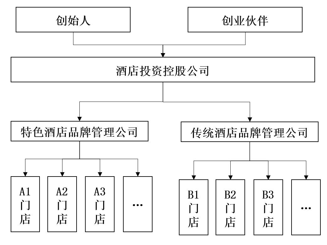 以金字塔控股公司为顶层主体架构,由创始大股东及创业伙伴股东共同持股设立酒店投资控股公司,用该公司分别控股传统酒店品牌管理公司与新特色酒店品牌管理公司,再由两个酒店品牌管理公司各自投资控股旗下的连锁酒店。