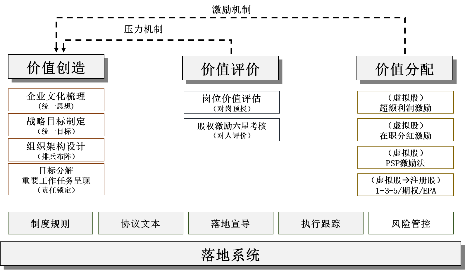 科学系统的股权激励方案设计的核心逻辑是价值链模型。企业通过股权激励计划的实施,就是要让员工在公司平台上发挥自己,创造价值,再通过平台的机制进行价值评价和价值分配,项目组的咨询思路也着眼于未来,有价值的创造和评价才有价值的分配,让员工能把公司平台当成是自己的事业平台,同时共享平台发展带来的收益。