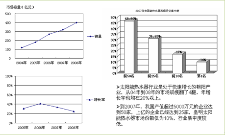直到2004年前,皇明还是太阳能热水器的霸主,市场份额高达50%以上,但2004年太阳能热水器整体市场仅100亿元,竞争者还没有进入集体爆发期。