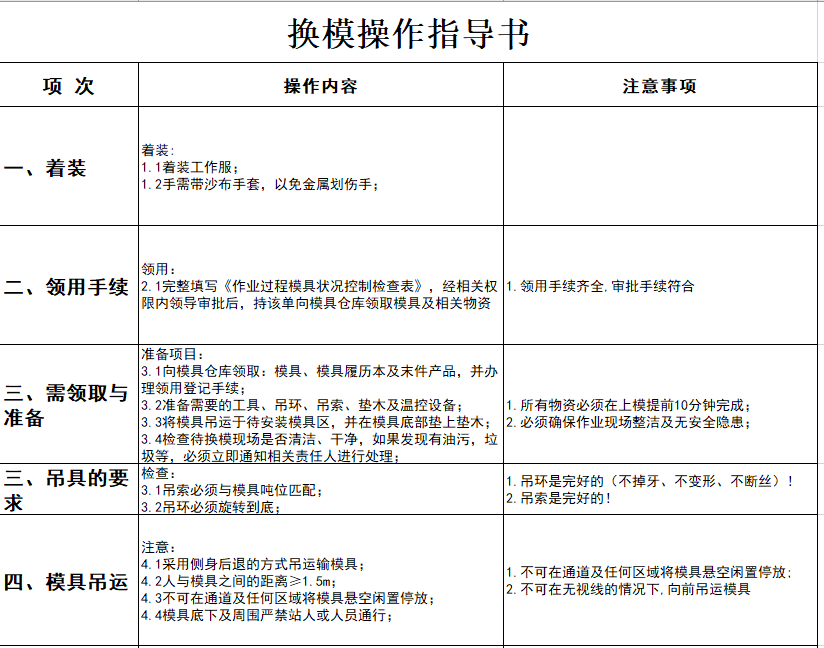 按照前期制定的内外部作业优化方法,经过1个月的实施,基本上作业内容固定下来,从而拟定换模标准流程(表3-16)。