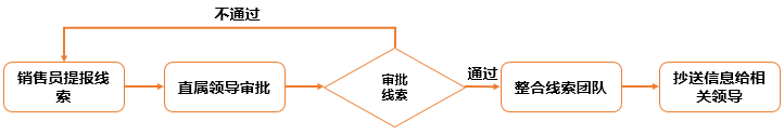 该流程主要是规范线索录入,如果有几个人都在跟踪该线索那么就整合成线索团队,形成合力争取订单,并在整合后将信息推送给相关领导。