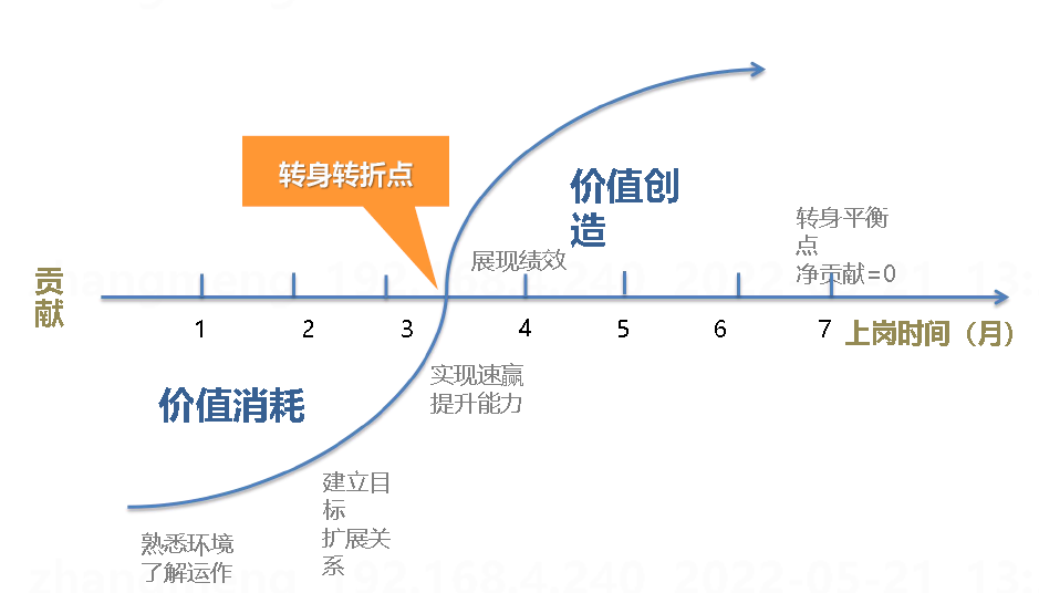 从转身的盈亏平衡曲线可以看出,新任干部转身期一般为6个月,转身转折点平均为3.2个月,在转身期对关键岗位的新任干部进行跟踪和使能,能够帮助新任干部从价值消耗到价值创造更快的转变。