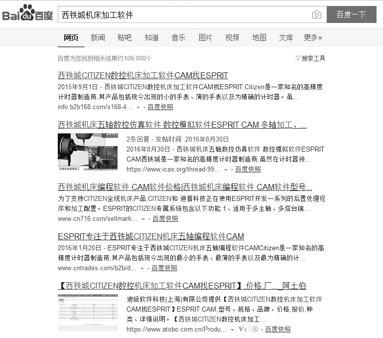 2017年9月4日8点42分,ESPRIT公司的灌水信息在百度搜索“西铁城数控机床加工软件”一词的前五页排名如下: