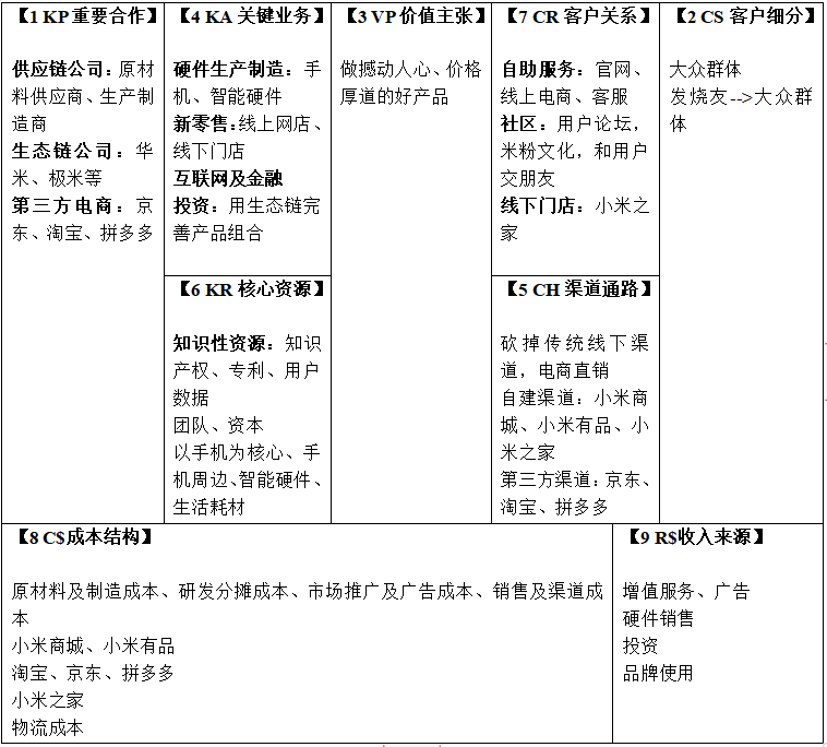 商业模式包含九个要素:重要合作、关键业务、核心资源、价值主张、客户关系、渠道通路、客户细分、成本结构、收入来源。小米的商业模式画布如表10-2所示。