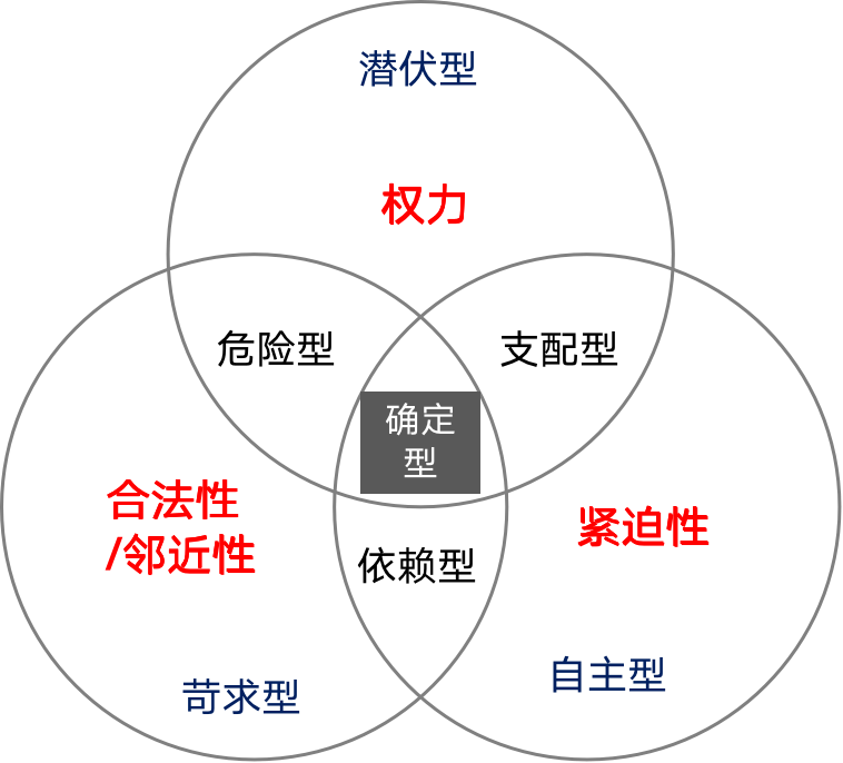凸显模型与干系人有关。“凸显”是指突出、显著或被视为重要。这一模型是由 Ronald K. Mitchell、Bradley R. Agle和Donna J. Wood提出的。这几位作者根据以下三个变量对干系人的身份进行表示:施加影响的权力、干系人与项目之间关系的合法性,以及干系人要求参与项目的紧急程度。在凸显模型中,也可以用邻近性取代合法性,以便考察干系人参与项目工作的程度。这种凸显模型适用于复杂的干系人大型社区,或在干系人社区内部存在复杂的关系网络。凸显模型可用于确定已识别干系人的相对重要性。如图6-13所示。