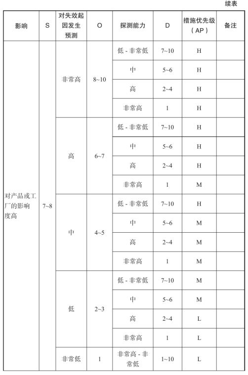 预防控制的有效性:在确定预防控制的有效性时,应考虑预防控制是否为技术措施(依靠机械设备、工具寿命、工具材料等),或应用最佳实践【夹具、工装设计、校准程序、防错确认、定期检修、工作说明、统计流程控制表、过程监控、产品设计等,或行为措施(依靠持有证书或未持有证书的操作人员、技术工人、团队领导等)】。