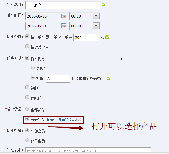具体我们来看下设置和操作步骤:先进入我的阿里——卖家交易管理——营销设置—满优惠设置——客户营销设置。活动名称可以称亏本清仓(或者是清仓处理),设置时间依据自己安排,优惠条件按订单价格选择。案例当中单笔满398元然后打8折(金额和打折按照自己的实际情况定),活动货品你是准备对所有的这样,还是指部分,如果是部分先选择所要打折清仓的产品。案例及呈现效果如图12-5和图12-6。