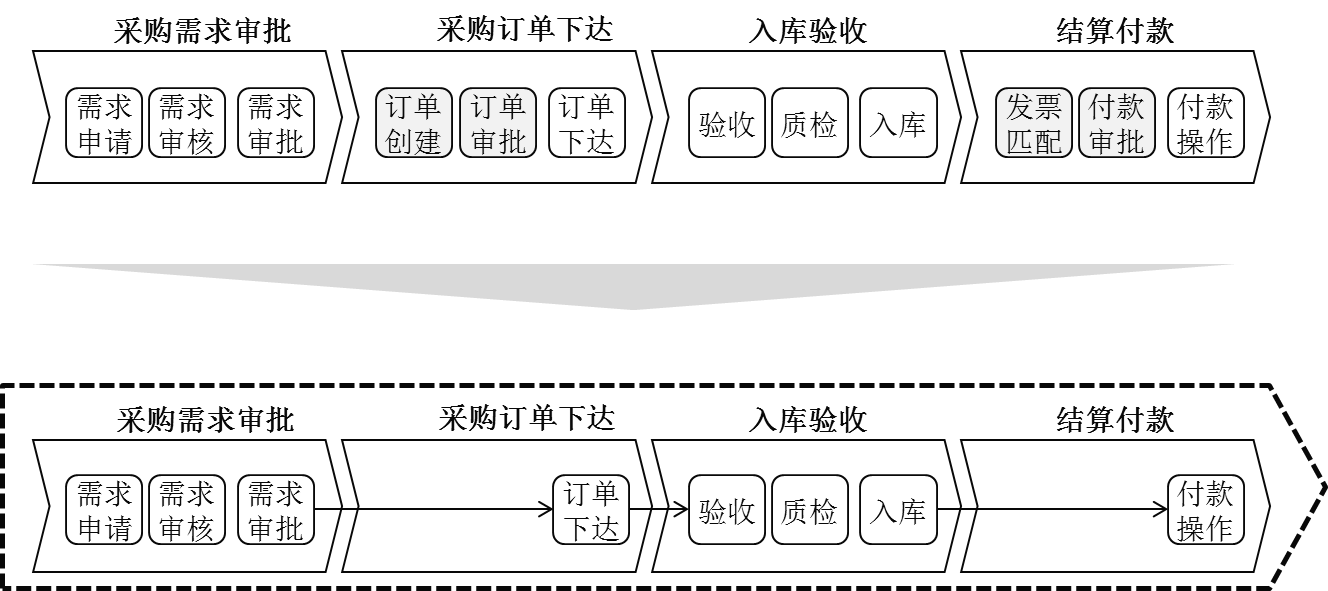 该企业P2P(from procurement to payment 从采购到付款)端到端流程优化前后对比如图4-4所示: